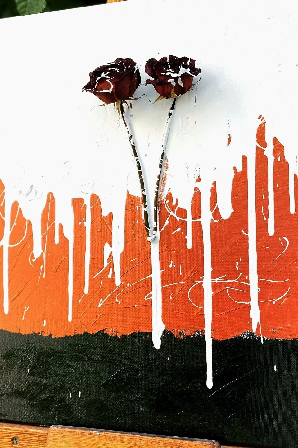 The real roses add texture and dimension to the image, bringing the painting to life.